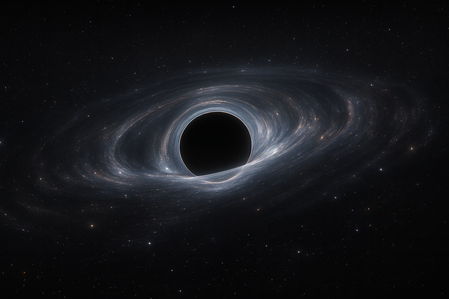 Figure 1: Representation of a possible scenario for the object, which includes a black hole that has a mass of about 300,000 times that of our Sun and an extended dark disk, which can only be characterised through their combined gravitational lensing effect on the distant Universe.