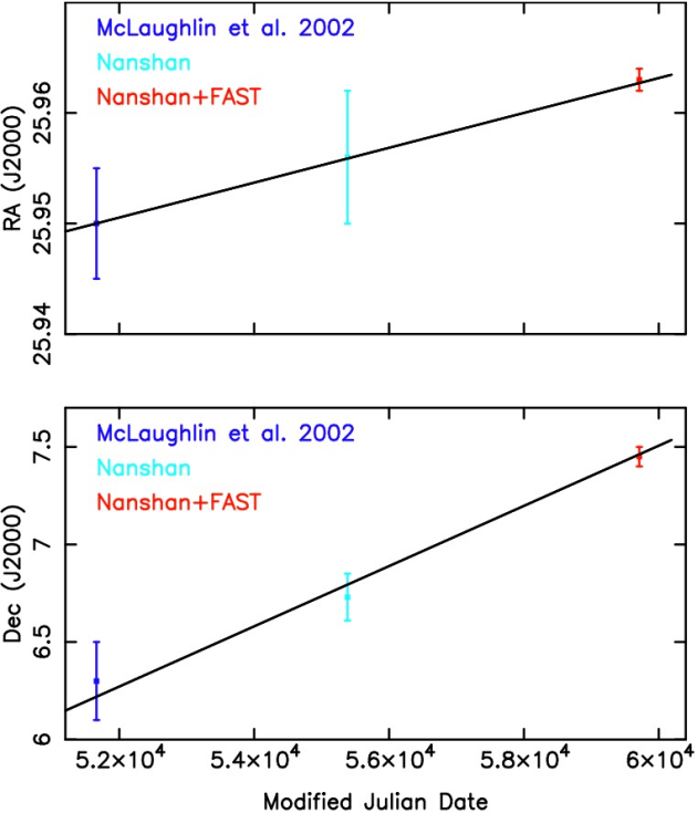 Using long-term observations from FAST (the Five-hundred-meter Aperture Spherical radio Telescope) and the Nanshan 26-m radio telescope, the team tracked the tiny positional changes of PSR J1740+1000 on the sky (its “proper motion”; see Fig. 1). Combined with its distance, they derived a space velocity of 329 ± 80 km s⁻¹. Based on its inferred space velocity, PSR J1740+1000 is likely to have formed in the Galactic halo and may be the descendant of a runaway OB star, i.e., a massive star ejected from its birth environment by violent astrophysical events and moving at high velocity.